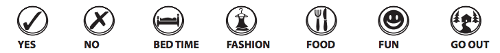 - "Go Out" - The outdoors icon with two trees, a pathway, and a house. Continue pressing until she is pointing to the desired outside activity, then press Yes to start.