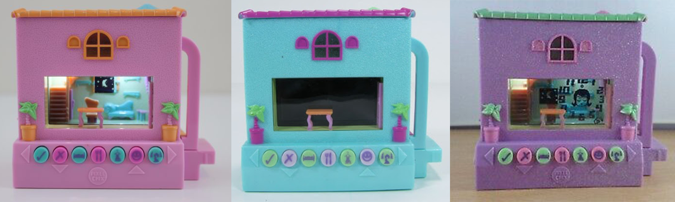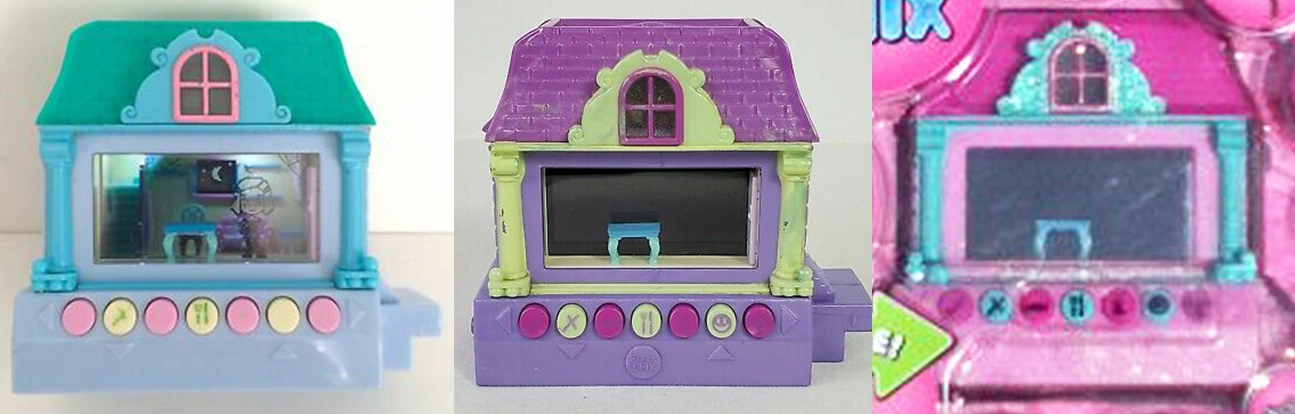 Houses all have a speaker on the top, a battery compartment on the bottom underneath, an internal connection port on the left side, an external connection port on the right side, a staircase just above the port which leads to a door, two solid windows on the back, and a window at the top near the roof which has a light in it. All houses also include the screen in which the game can be played, with a row of buttons just below. Behind the screen is a living room setup of a background window, shelves, a side-table on the very right, a sofa next to this, a dining chair, and a staircase on the very left. In front of the LCD screen is a table, which sits behind a plain clear plastic window. Having the table in front of the LCD screen helps the illusion that the Gal is interacting with her 3-D environment when she sits in the dining chair.