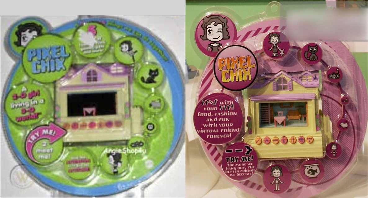 Pixel Chix™ pal is a 2-D Girl Living in a 3-D World™, totally unique, totally fun and totally cool! To interact with your Pixel Chix™ pal just "push her buttons" literally! Using the input buttons on the fashionable, handheld house, help your Pixel Chix™ pal decide all kinds of things, like what to do: play guitar or go rollerblading? Where to go tonight; on a date or to a concert? What to wear; a skirt or a bathing suit? What to eat, even when to go to bed. Your Pixel Chick™ pal will talk to you and tell you what she wants. She?ll tell you if she's happy (or not!) about the choices you make. There are five levels of play. At each new level accumulate more choices of foods, fashions, games and places to go! The more you play, the more stuff you get but if you ignore your Pixel Chix™ pal, the more stuff you lose! Connect two houses together and then the Pixel Chix™ pals can visit or have a party! There are three different houses in the assortment Connect them together and they'll each do a coordinated activity like talk on the phone in their respective houses.